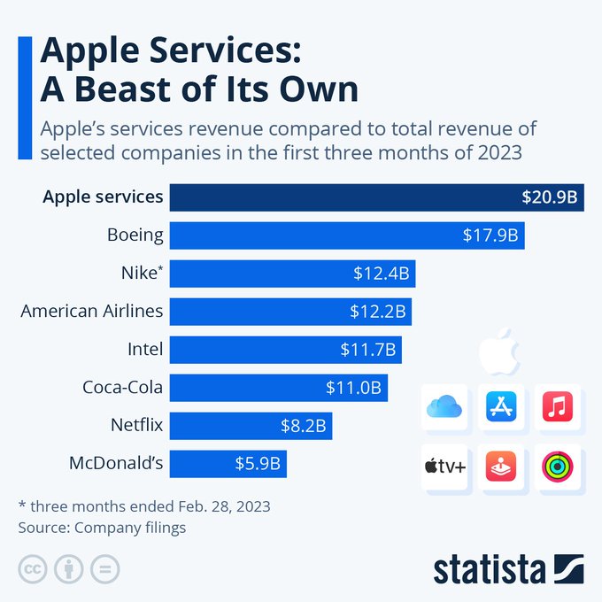 Les services d'Apple, qui englobent des plateformes telles que l'App Store, iCloud, Apple Care, Apple Music, Apple TV+ et Apple Pay, sont devenus une véritable mine d'or pour l'entreprise de Cupertino. Cette réalité est d'autant plus évidente lorsque l'on compare les résultats d'Apple avec ceux d'autres grandes entreprises américaines. Selon les analystes de Statista, les services d'Apple génèrent un chiffre d'affaires supérieur à celui de Coca-Cola et Netflix réunis, ainsi qu'à ceux de Boeing, Nike, American Airlines, Intel et McDonald's.